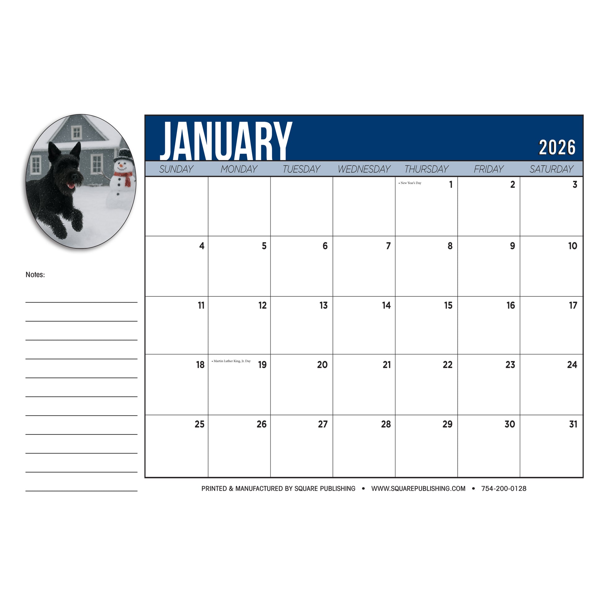 Organize your year in style with this 2026 Schnauzer desktop calendar, available in black and Navy blue. Each month showcases charming, high-resolution Schnauzer photography themed around the seasons—winter scenes, Valentine’s hearts, St. Patrick’s Day greens, Easter motifs, patriotic July 4th images, fall foliage, and warm holiday moments. The large 19"x13" desktop monthly calendar provides generous room to track appointments, work schedules, family activities, school events, and personal goals. A dedicated notes section on every page helps keep your tasks organized throughout the year, and major U.S. holidays are clearly marked for quick reference. Printed on premium-quality paper with vivid color reproduction, this desktop calendar enhances any workspace—office desk, home desk, classroom table, studio, or pet-themed workstation. A perfect gift for Schnauzer owners, dog lovers, and anyone who enjoys stylish and functional desk organization.